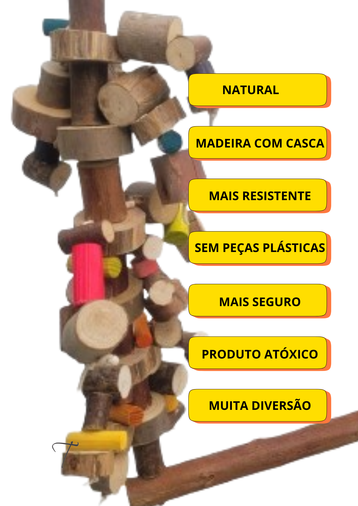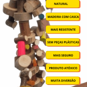 Feito de eucalipto com casca e pequenos toques de peças de pinus coloridas, juntando a durabilidade da madeira com casca e pontos de cor que chamam a atenção da sua ave.