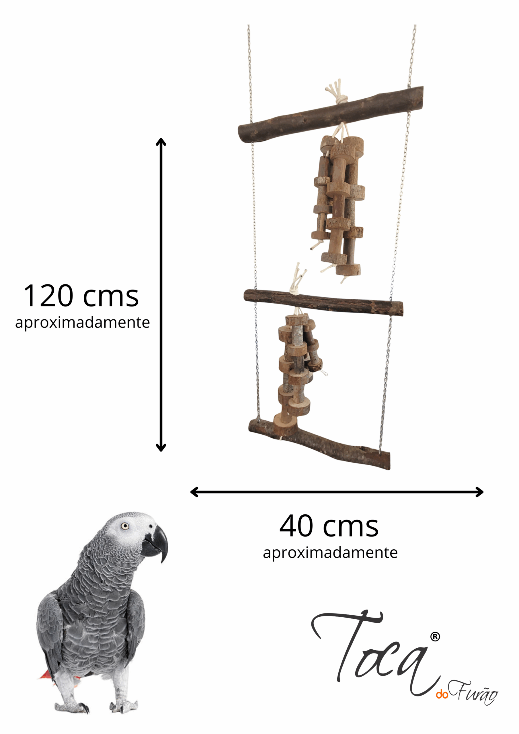 Com três degraus e alças de corrente , possui dois cachos com penduricalhos rústicos, que vão atrair a atenção da sua ave enquanto balança., ótimo brinquedo para tirar a ansiedade e estresse, ja que além do balanço a destruição dos penduricalhos está liberada.