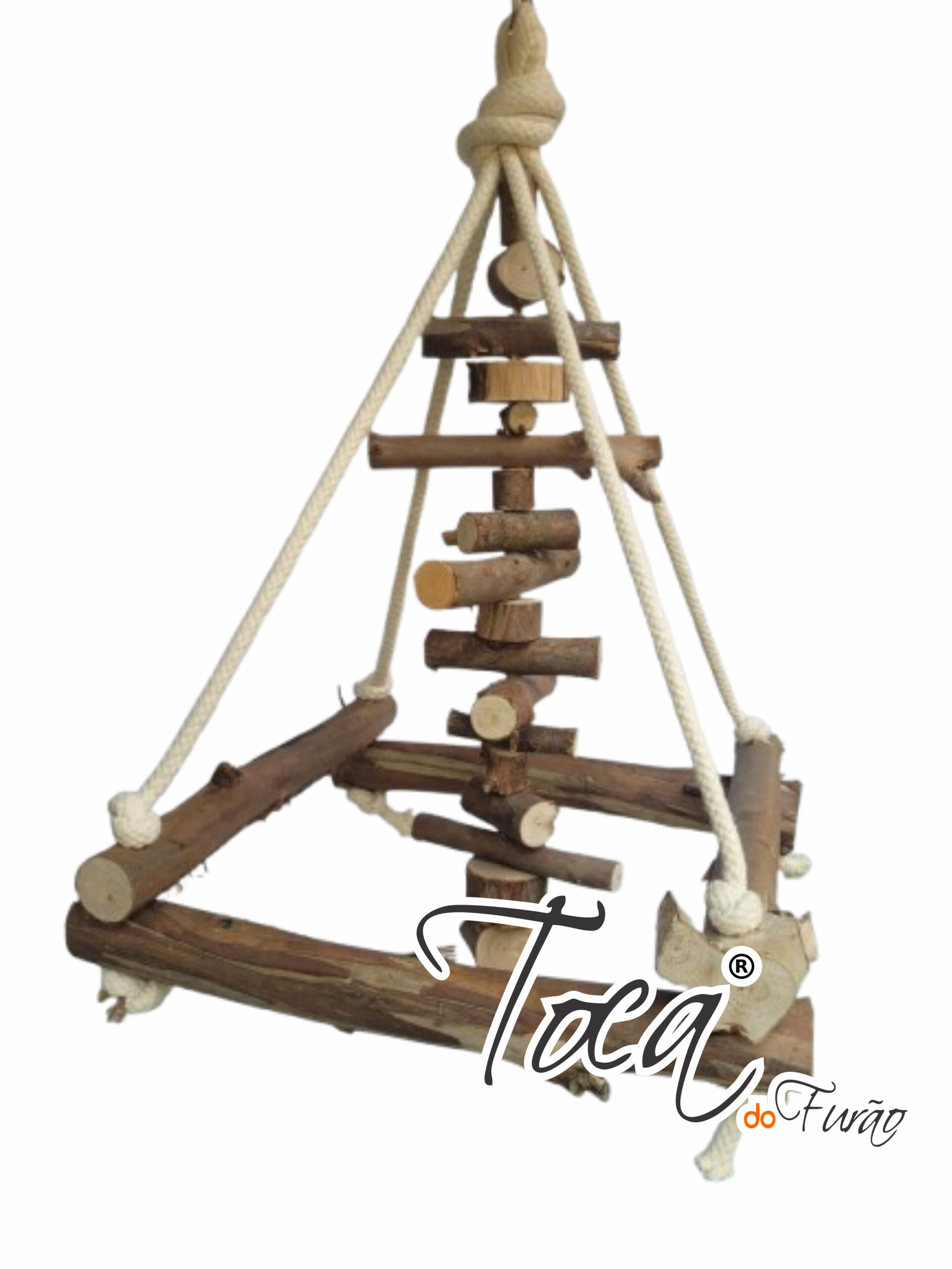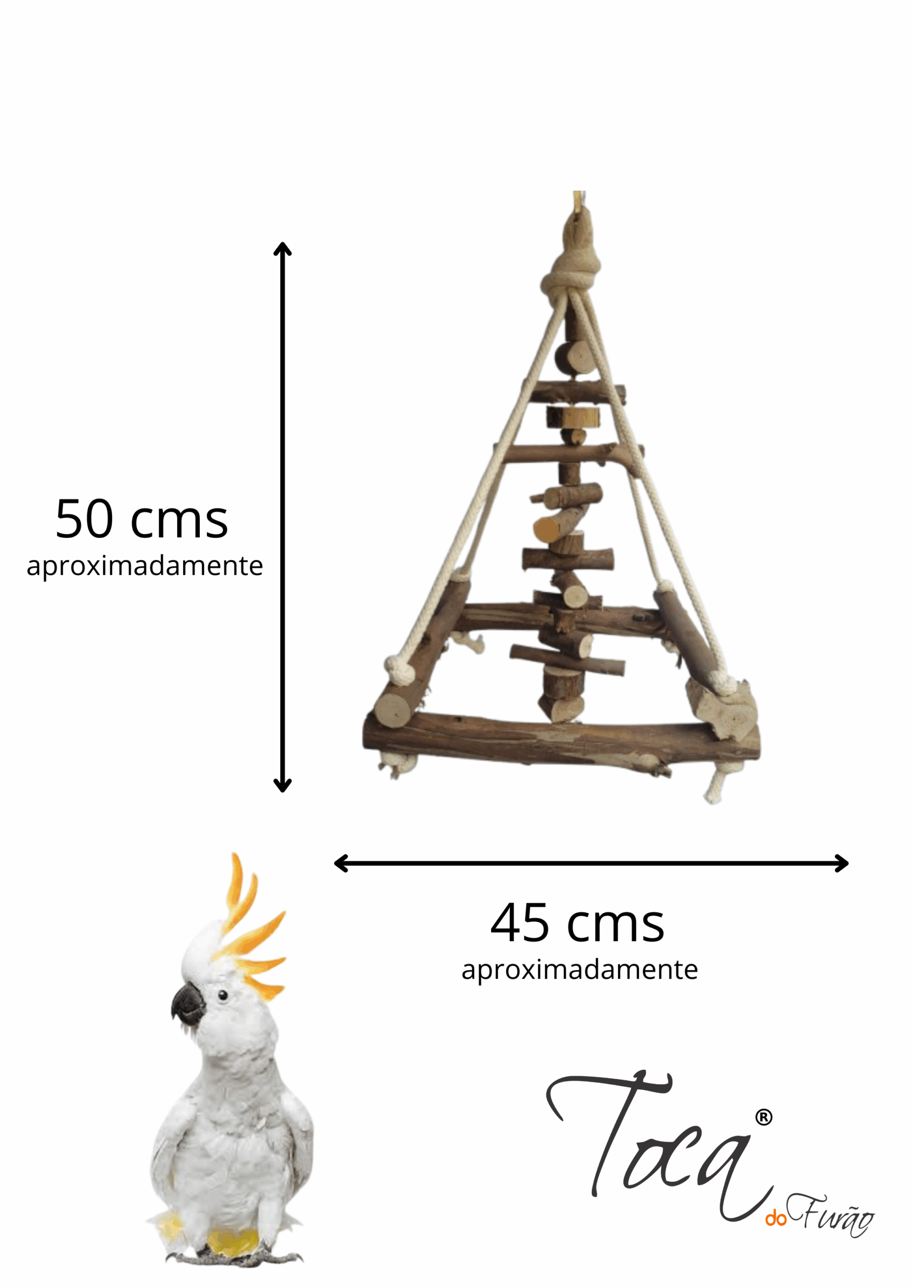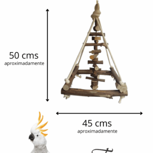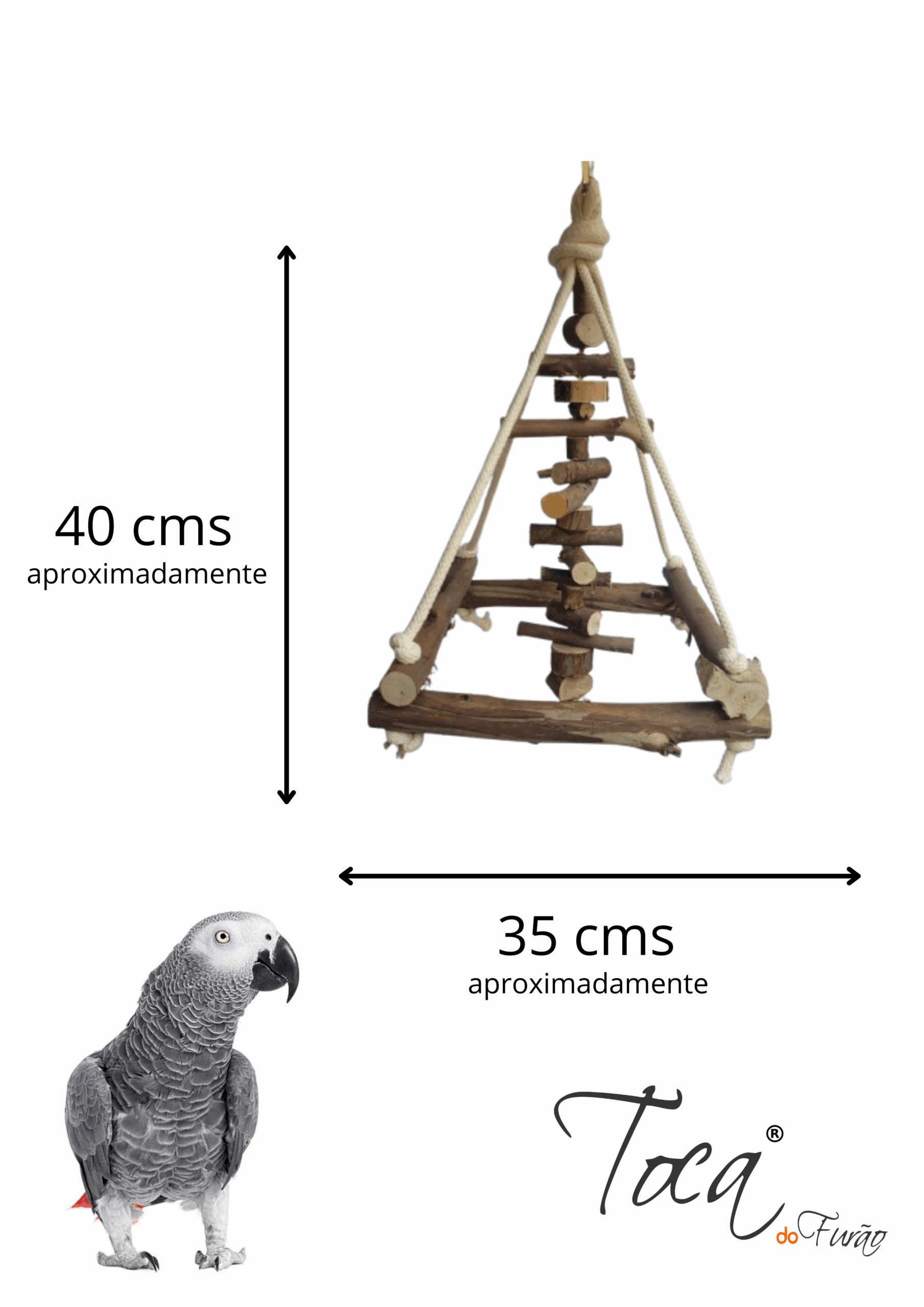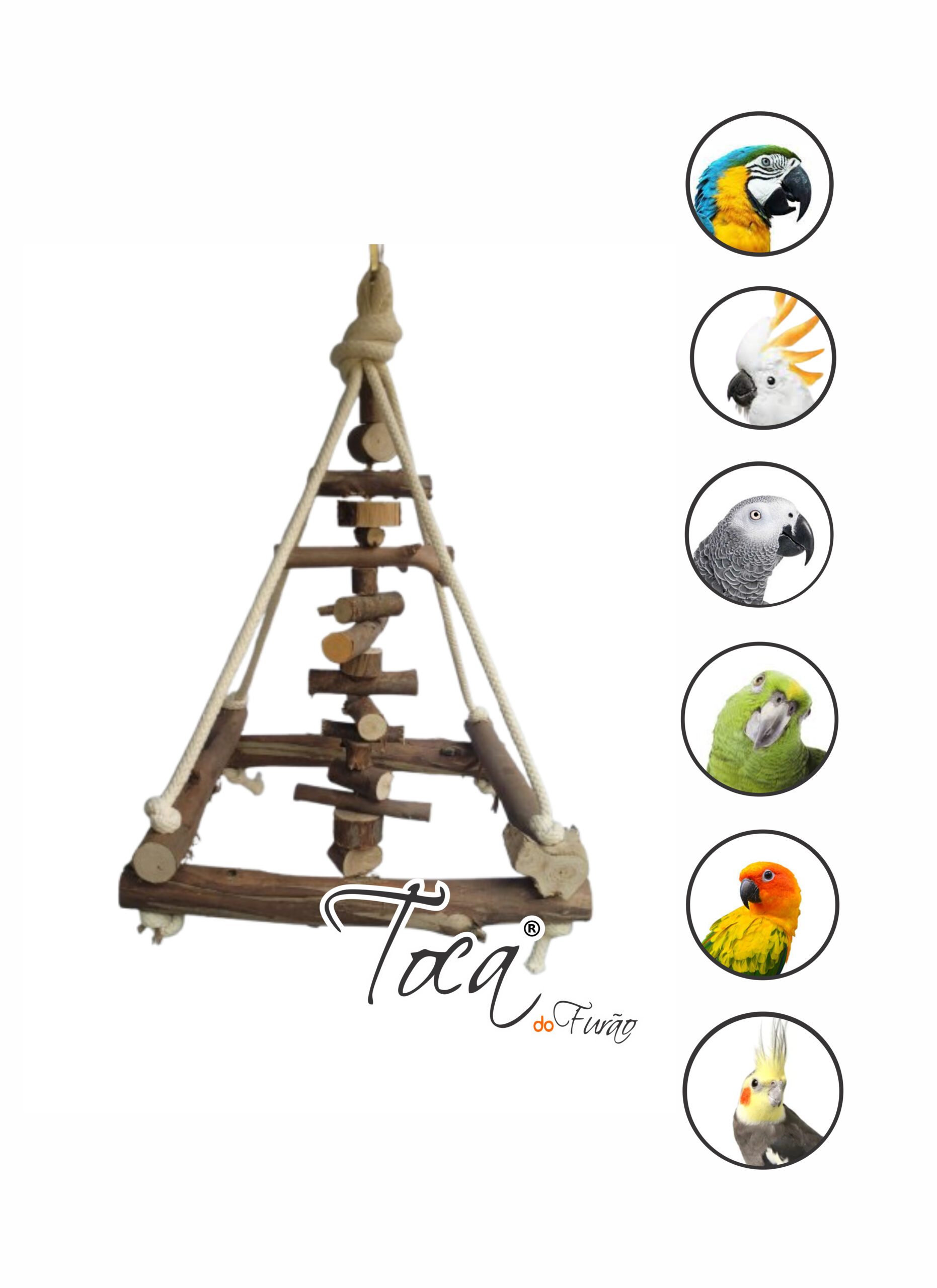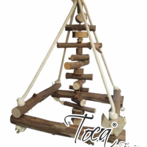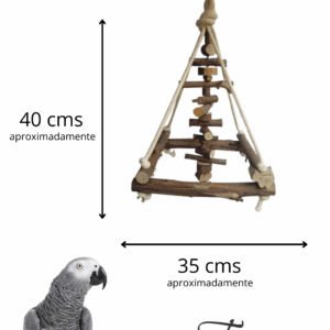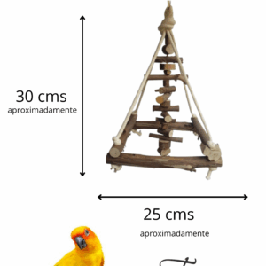 Uma versão pocket do queridinho brinquedão pendurado, mas ainda mais divertido com um penduricalho no meio para chamar ainda mais atenção da sua ave, todo rústico para quem quer um produto super natural