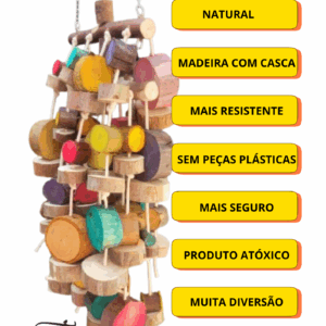 Grandalhão, todo de eucalipto, o que deixa a peça ainda mais resistente, com um toque de cor, algumas peças coloridas para chamar ainda mais atenção da sua ave, e ser mais um estímulo.