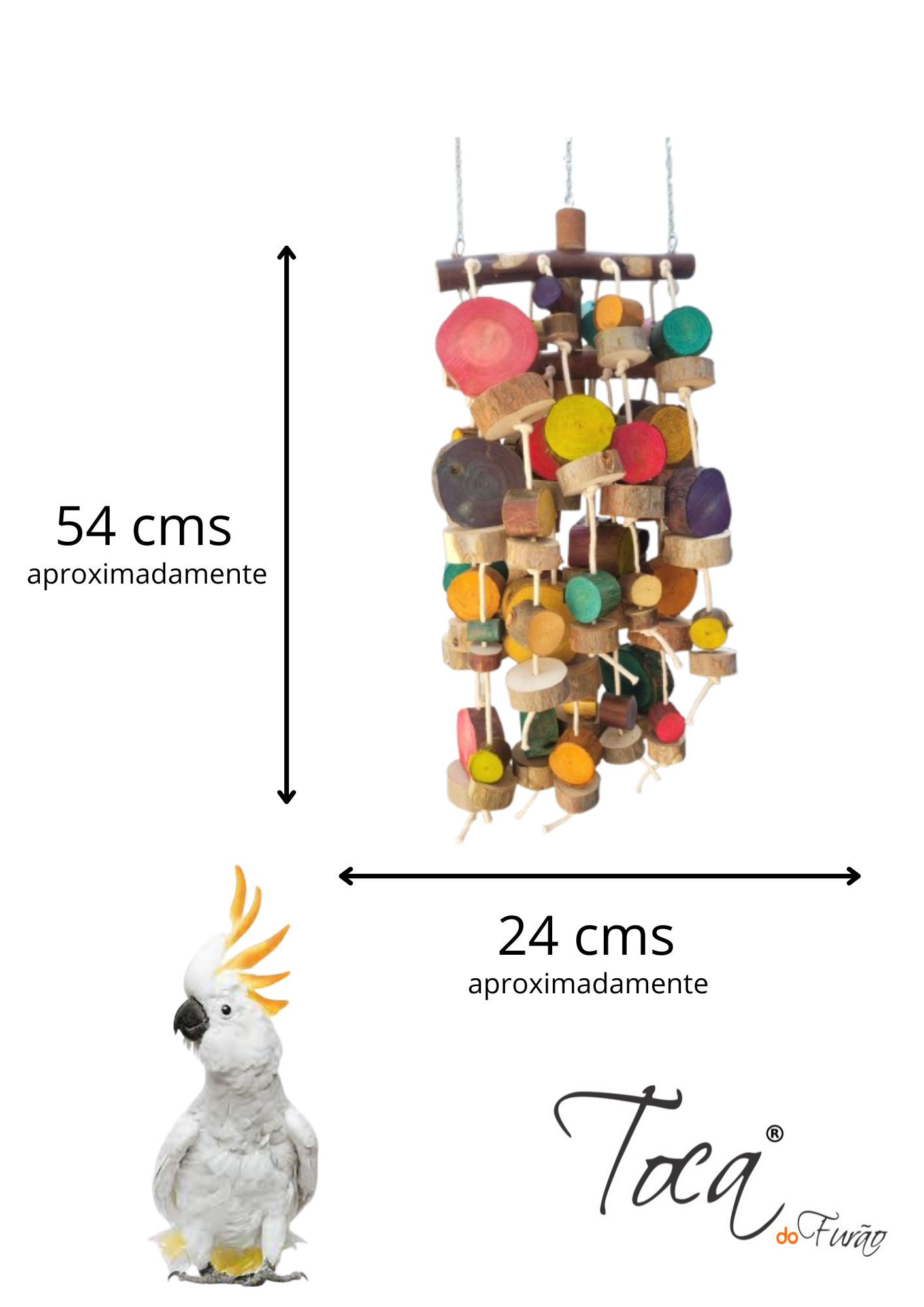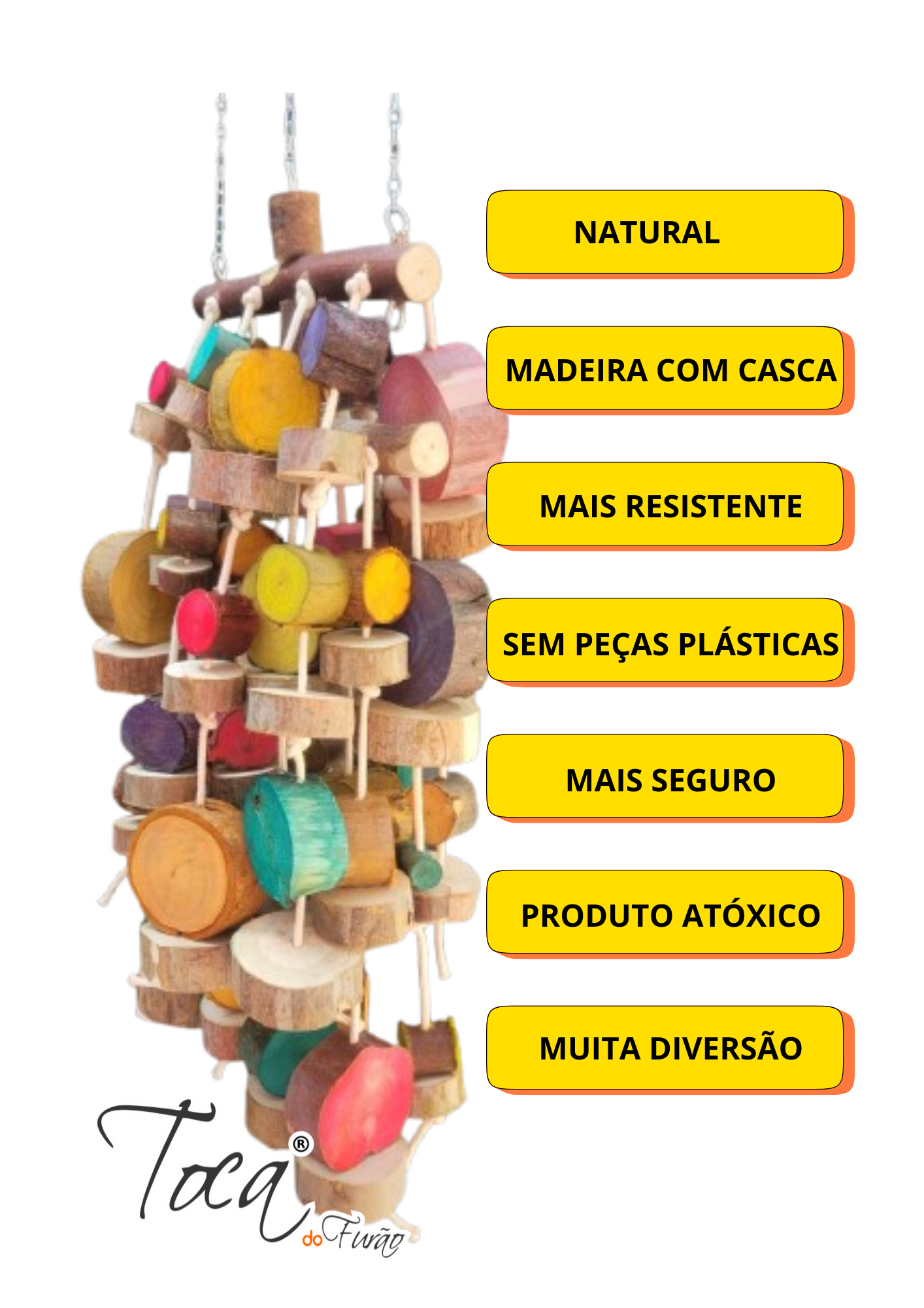 Com correntes curtas, esse brinquedo fica mais pertinho do teto da gaiola ou viveiro, como ele é bem pesado, esse brinquedo é fixado em três pontos com mosquetões para distribuir o peso.