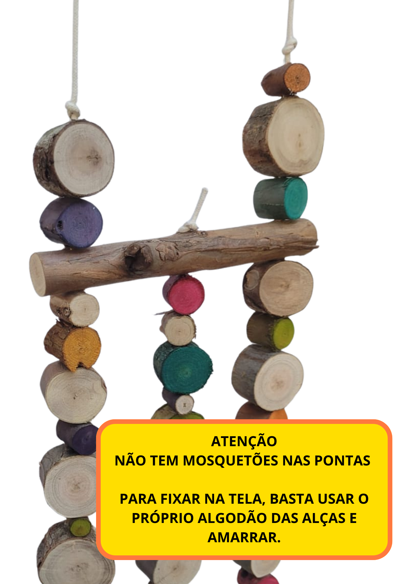 Não possui corrente, não possui mosquetão, não tem nenhum tipo de arame na estrutura …a peça é apenas madeira e algodão 100%