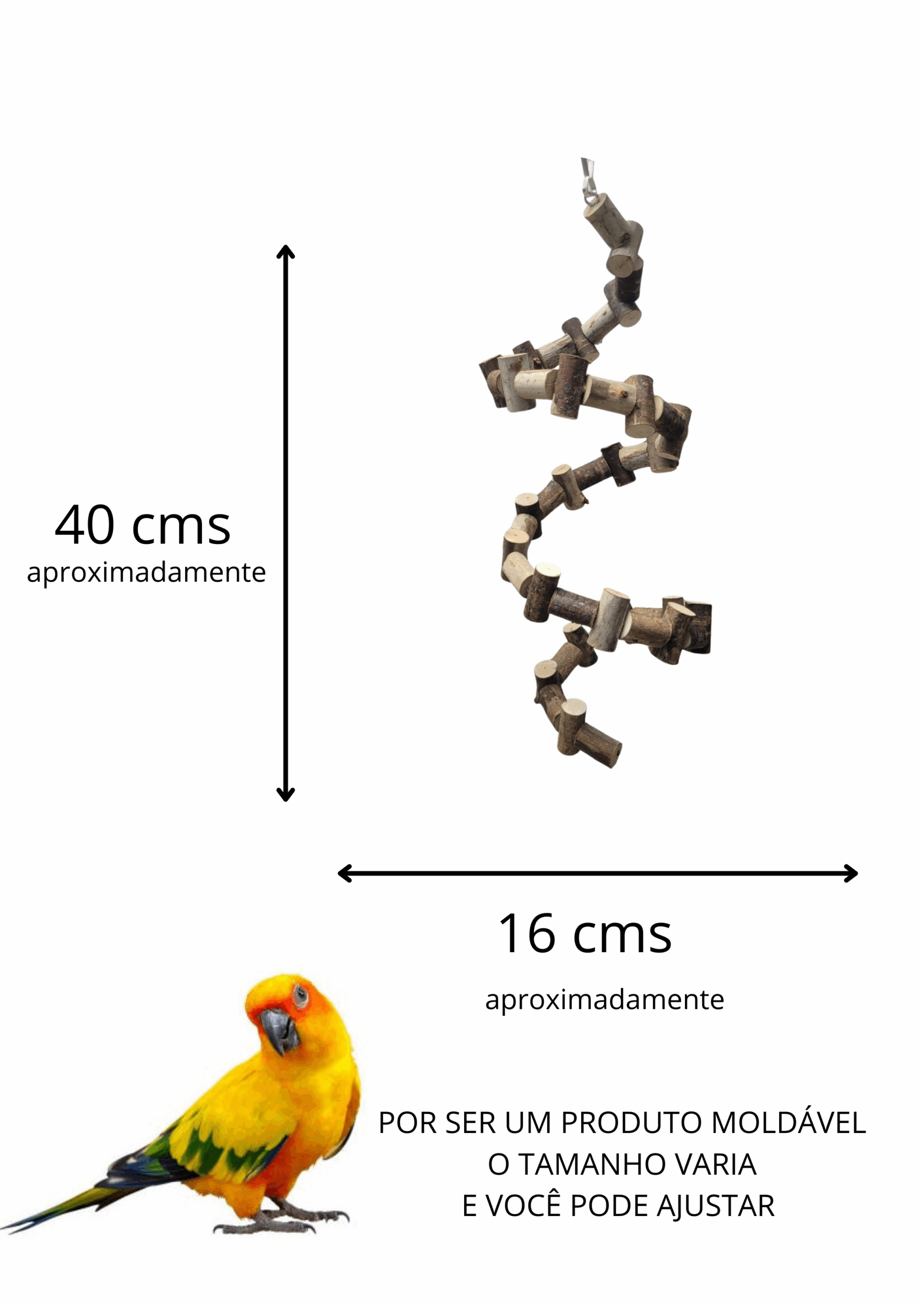 Selecionamos a madeira adequada para cada tamanho de brinquedo e ave que terá contato com ele, mas ainda assim pode haver uma variação de diâmetro na madeira utilizada.