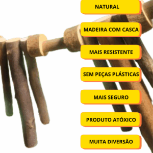 Feito para ser um brinquedo mais durável para as aves maiores e mais destruidoras, feito de eucalipto com casca, essa madeira natural, faz com que o brinquedo dure ainda mais, além do tamanho e da espessura das madeiras utilizadas, tudo foi pensado especialmente para você que tem uma aves que precise de brinquedos mais resistentes.